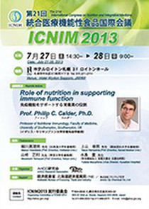 Á¦21ȸ ÅëÇÕÀÇ·á ±â´É¼º ½Äǰ ±¹Á¦ ȸÀÇ(ICNIM2013)³¯Â¥ : 2013³â 7¿ù 27ÀÏ(Åä)~28ÀÏ(ÀÏ) Àå¼Ò : »ñÆ÷·Î½Ã(·ÎÀÌÆ° »ñÆ÷·Î) ÁÖÃÖ : AHCC¿¬±¸È¸ ÈÄ¿ø : °æÁ¦ »ê¾÷¼º ȪīÀ̵µ °æÁ¦ »ê¾÷±¹, ÁÖ½Äȸ»ç ¾Æ¹Ì³ë¾÷ÈÇÐ Á¦21ȸ ÅëÇÕÀÇ·á ±â´É¼º ½Äǰ ±¹Á¦È¸ÀÇ(ICNIM2013)°¡ ÀϺ» »ñÆ÷·Î¿¡¼ °³ÃֵǾú½À´Ï´Ù. ÅëÇÕÀÇ·á ±â´É¼º ½Äǰ ±¹Á¦È¸ÀÇ ICNIMÀº AHCC ¿¬±¸È¸°¡ ÁÖÃÖÇϰí ÀϺ» ȪīÀ̵µ °æÁ¦»ê¾÷±¹, ÁÖ½Äȸ»ç ¾Æ¹Ì³ë¾÷ÈÇÐÀÌ ÈÄ¿øÇÕ´Ï´Ù. ¿ÃÇØ´Â Àü¼¼°è ¾à20¿©°³±¹ 300¿©¸íÀÇ °ü°èÀÚ°¡ ICNIM2013¿¡ ¹æ¹®ÇÏ¿´½À´Ï´Ù. Keynote Lecture¡°Role of Nutrition in Supporting Immune Function¡±Philip C. Calder £¨University of Southampton, UK£© Oral Sessions¡°Oligonol Suppresses Pro-inflammatory Cytokines from Human Monocytes¡±Insoo Kang, et al. £¨Yale University School of Medicine, USA£©¡°Oligonol Inhibits Experimentally Induced Colitis and Colon Tumor Formation in Mice¡±Young-Joon Surh, et al. £¨Seoul National University, Korea£©¡°Evaluation of Metabolism Pathways of AHCC and the Implications for Drug-drug Interactions¡±Larry Coffer, et al. £¨The University of Texas M.D. Anderson Cancer Center, USA£©¡°Clinical Effects of AHCC on Refractory Non-tuberculous Mycobacterium Infection¡±Kentaro Wakamatsu (Omuta Hospital, Japan)¡°Decisive AHCC Action in a Severe Malnutrition Patient¡±Francisco Karkow, et al. £¨Universidade de Caxias do Sul, Brazil£©¡°Effect of AHCC on the Autonomic Nervous Function¡±Tatsuya Hisajima (Teikyo Heisei University, Japan)¡°Enzyme-treated Asparagus Extract (ETAS) Suppresses the Production of the Inflammatory Mediator Nitric Oxide in Rat Hepatocytes¡±Mikio Nishizawa (Ritsumeikan University, Japan)¡°Inhibitory Effect of ETAS against Amyloid Beta-induced Cellular Disorder in PC12 Cells¡±Junetsu Ogasawara (Kyorin University, Japan)¡°The Discovery of a Novel Functional Constituent Extracted from Asparagus: Its Effectiveness for Stress Reduction, and Potential Use for Prevention of Sleep Disorders¡±Jun Nishihira (Hokkaido Information University, Japan)¡°Effect of AHCC on CD4+CD62L+ T Cell-transfer Induced Colitis in RAG Mice¡±Fermin Sanchez de Medina, et al. £¨University of Granada, Spain£©¡°Role of Breast Cancer Stem Cells in Cancer Chemoprevention by AHCC¡±Chantal Matar, et al. £¨University of Ottawa, Canada£©¡°Effects of AHCC on Tumor Growth and Development¡±Taisei Nomura (National Institute of Biomedical Innovation, Japan)¡°Immune Modulation Associated with Consumption of a Unique Nutraceutical Blend Containing AHCC and the Probiotic Bacterium Bifidobacterium lactis BB12 £A Double-blind Randomized Placebo-controlled Clinical Study£¡±Kathleen F. Benson, et al. £¨NIS Labs, USA£©¡°Effect of Frequent Antioxidant Supplementation on Oxidative Stress When Climbing Mt. Fuji¡±Junichi Nagasawa (The University of Electro-Communications, Japan)¡°Oligonol Supplementation Attenuates the Circulating Levels of Prostaglandin E2 and Cyclooxygenase-2, and Body Temperature after Heat Stress in Humans¡±Jeong Beom Lee, et al. £¨Soonchunhyang University, Korea£©¡°Constituents in Perilla Extract Inhibit Production of Nitric Oxide in Rat Hepatocytes (3)¡±Yukinobu Ikeya (Ritsumeikan University, Japan)¡°Testing of a Special Perilla Frutescens Extract and Vicenin 2 for Their Antispasmodic Effect¡±Eugen J. Verspohl, et al. £¨University of Muenster, Germany£©¡°AHCC as Nutritional Supplement in Patients with a History of Cancer: Preliminary Results¡±Massimo Bonucci, et al. £¨San Feliciano Clinic, Italy£©¡°AHCC¡¯s Impact on the Immunological System in Patients with Disseminated Neuroendocrine Tumors (NETs) within Three Months after Treatment with the Radioisotope Preparation (90Y-DOTA-TATE) £An Initial Report£¡±Norbert Szalus, et al. £¨Central Clinical Hospital of Ministry of Interior and Administration, Poland£©¡°Adjuvant AHCC Compared with Placebo in Decreasing Grade 2 and above Treatment-related Side Effects for Head and Neck Malignancies Undergoing Concurrent Chemo-radiation Therapy (AD-AHCC Trial)¡±Gonzalo C. Banuelos Jr., et al. £¨St. Frances Cabrini Medical Center and Cancer Institute, Philippines£©¡°Efficacy of Oral AHCC Supplementation in Female Breast Cancer Patients Undergoing Anthracycline and Taxane Based Adjuvant Chemotherapy Randomized, Double-blind, Placebo Controlled, Phase-II Study: A Study Protocol¡±Tempei Miyaji (The University of Tokyo, Japan) Poster Session ¡°Effects of AHCC in an Animal Model of Inflammation-induced Oxidative Stress¡±Marie-Francoise Doursout, et al. £¨University of Texas Medical School, USA£©¡°AHCC Affords Specific Immunological Effects on T Cells in Physiological and Immunological Stressed Environments¡±Alamelu Sundaresan, et al. £¨Texas Southern University, USA£©¡°Activation of Skin by AHCC¡±Toshihiro Ona (Kyushu University, Japan)¡°Effect of AHCC on IFN-¥á1 Antisense RNA and mRNA Expression Levels: A Molecular Analysis of Action¡±Tomoaki Nakano (Ritsumeikan University, Japan)¡°Effects of AHCC on the Lifespan Extension and Thermotolerance of the Nematode C. elegans¡±Tetsuya Okuyama (Ritsumeikan Global Innovation Research Organization, Japan)¡°Protective Activity of Combination of AHCC and UREX against Murine Urinary Tract Infection¡±Kazumi Hayama (Teikyo University, Japan)¡°Effects of AHCC Supplementation on 5-Fluorouracil (5-FU)-induced Impairment of Gut Immunity in Mice¡±Shunsuke Amenomori (Nippon Medical School, Japan)¡°Effect of Bifidus BB536 and AHCC on Immune Function in Healthy Individuals¡±Abeed H. Chowdhury, et al. £¨University of Nottingham, UK£©¡°Are There Any Immunological Changes in Healthy Subjects after Three Months Intake of